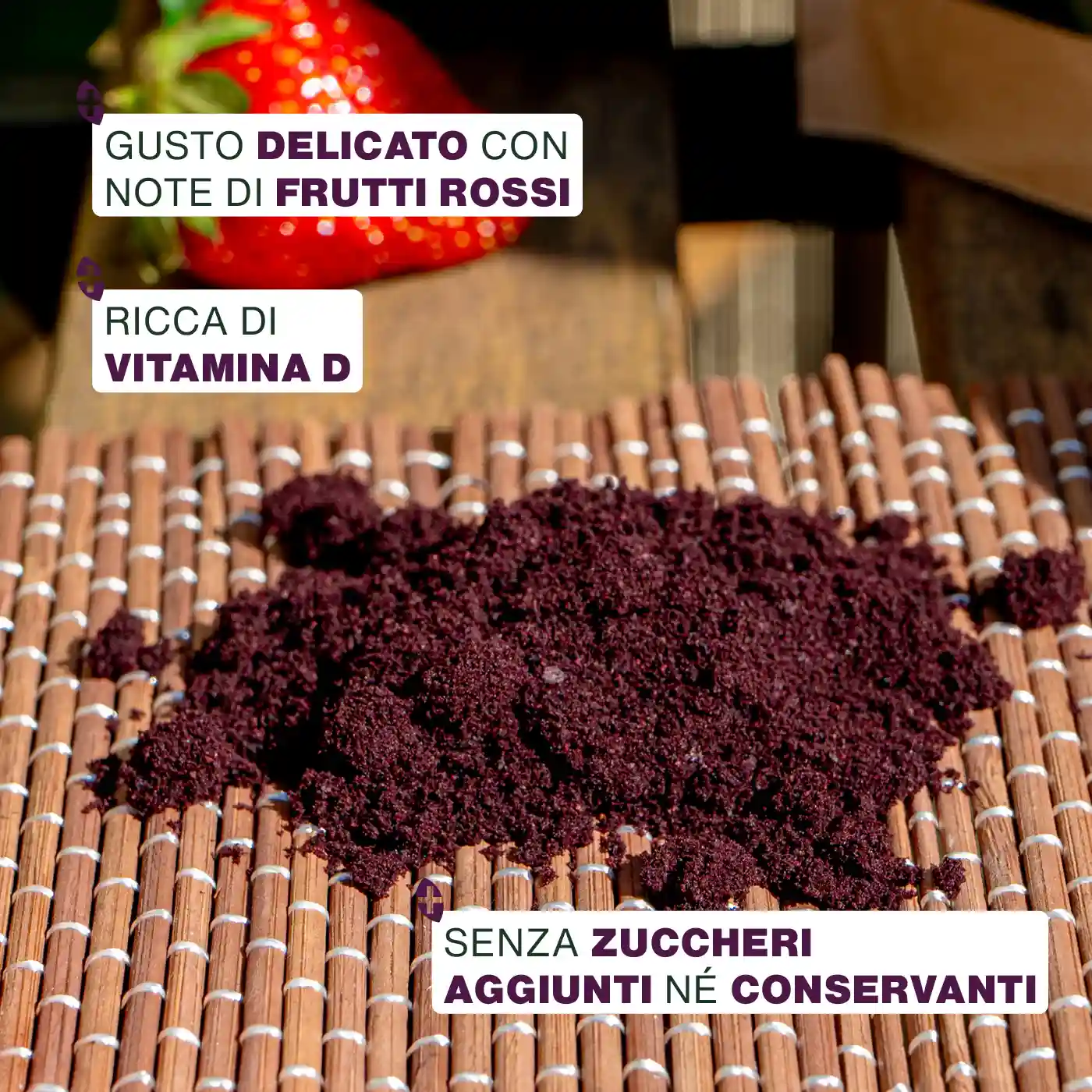 IMMUNITÀ E OSSA FORTI: le bacche di Açaí Bio, consumate da secoli dalle popolazioni dell’America del Sud, sono naturalmente ricche di vitamina D, un nutriente essenziale per garantire un sistema immunitario solido e una struttura ossea sana. Infatti, la vitamina D è nota per favorire l’assorbimento del calcio e aiutare a mantenere uno scheletro forte, oltre a sostenere il corretto funzionamento del sistema immunitario. Ecco perché il nostro Açaí Bio è particolarmente indicato nei momenti di stanchezza o durante i cambi di stagione, per sostenere le difese in modo naturale.
