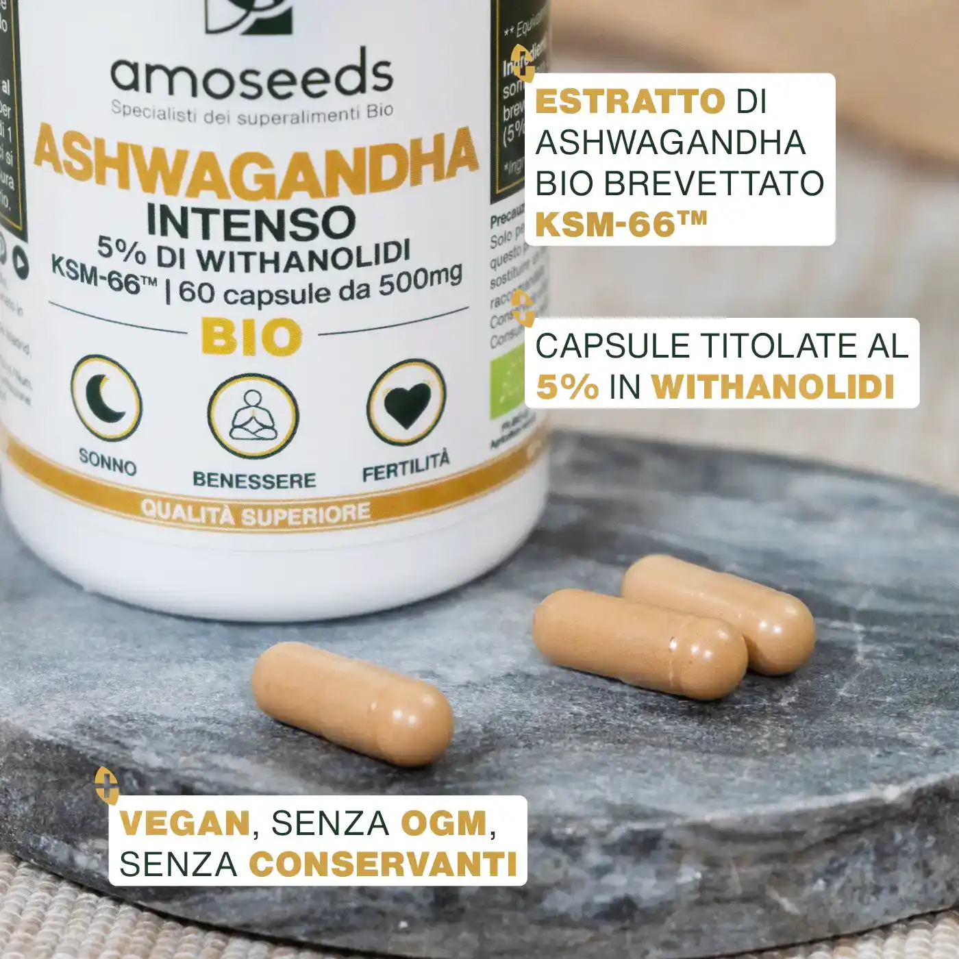EFFICACIA, 5% di WITHANOLIDI: il nostro estratto di Ashwagandha Biologica è brevettato KSM-66™, ovvero è ottenuto esclusivamente dalle radici della pianta e ne concentra il massimo dei principi attivi. Questo estratto viene poi inserito in capsule vegane con una biodisponibilità incomparabile (assorbimento intestinale ottimale). Le nostre capsule di Ashwagandha KSM-66™ Bio offrono quindi un'efficacia comprovata da studi clinici, che consente un miglioramento dello stato fisico e mentale generale. KSM-66™ è il risultato di anni di ricerca e sviluppo per ottenere un prodotto con la più alta concentrazione di withanolidi (5%) sul mercato dei prodotti biologici. Questa particolarità gli permette di agire su numerosi parametri fisici e mentali, per offrire un benessere generale (migliorando sonno, stress, energia, etc.).