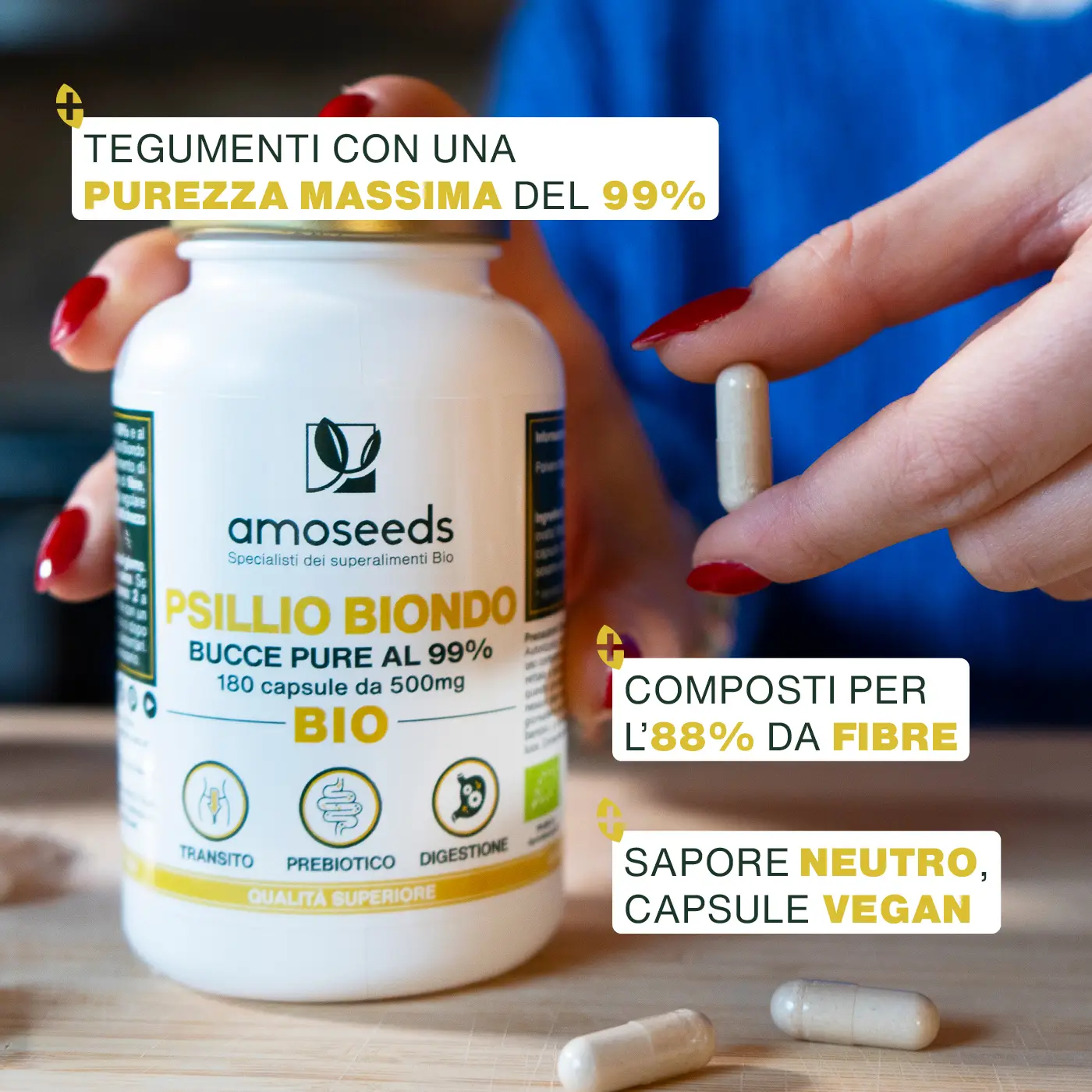 - CERTIFICAZIONE BIOLOGICA: scatola riciclabile e richiudibile da 180 capsule da 500mg di Bucce di Psillio Biondo Biologici con una purezza massima del 99%. Prodotto 100% puro, vegano, senza additivi, senza ossido di etilene, senza conservanti, senza OGM, senza pesticidi, senza coloranti artificiali, senza glutine e senza lattosio. Ogni lotto è testato da terzi per garantirne qualità e purezza. Psillio Biondo Bio coltivato in India. Fabbricato, analizzato e confezionato in Francia.
