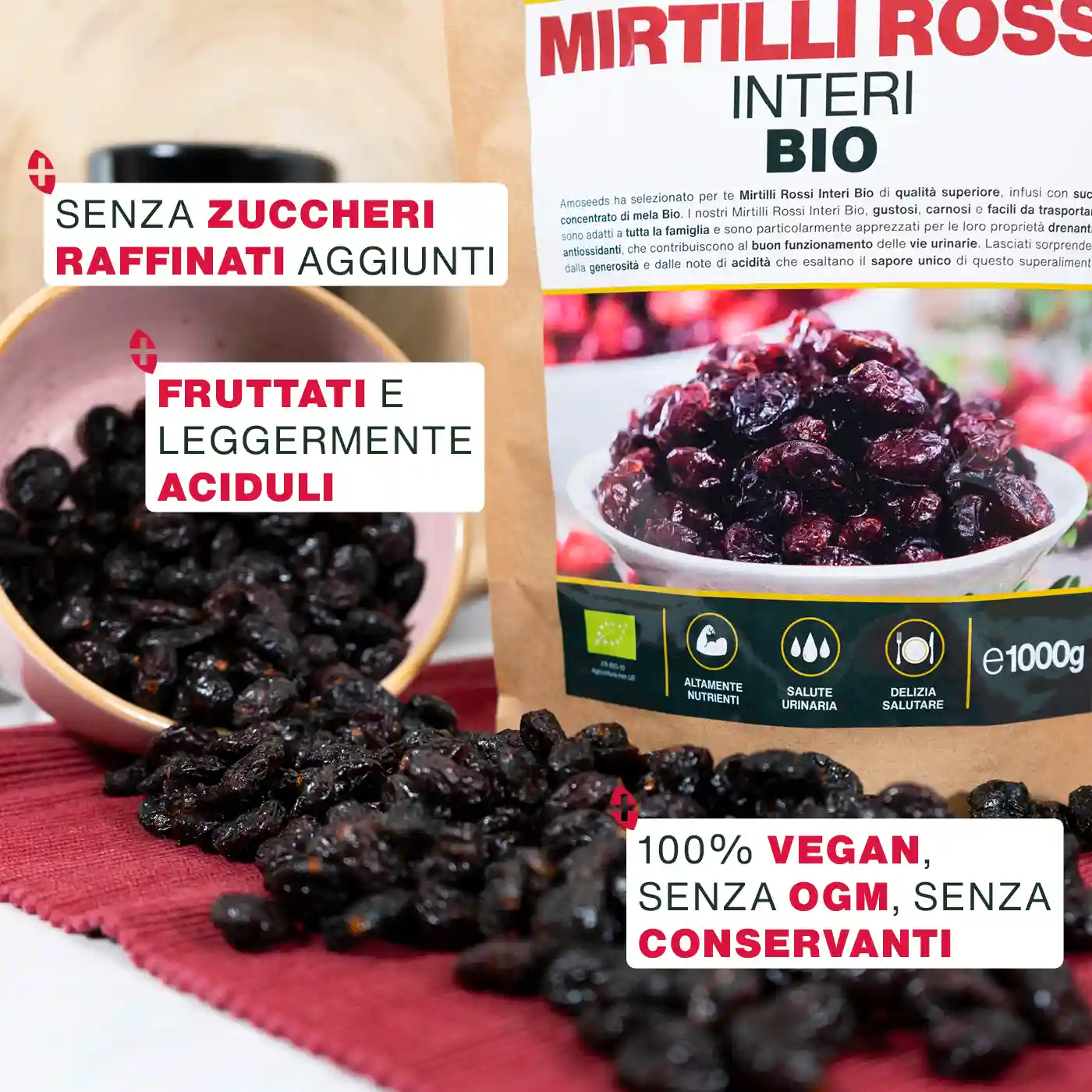 - CERTIFICATI BIOLOGICI: bustina Kraft richiudibile da 1kg di Mirtilli Rossi Biologici di qualità superiore Amoseeds. Prodotto naturale al 100%, senza zuccheri aggiunti, vegano, senza additivi, senza lattosio e senza glutine. Ogni lotto viene testato e sottoposto a controlli in laboratori esterni per garantirti un prodotto puro e qualitativo al 100%.