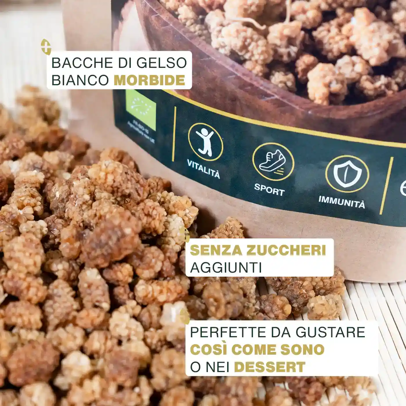 Le More di Gelso Bianco, da non confondere con le more e note anche come "gelsi bianchi", sono piccole bacche che crescono sull'albero del gelso bianco. Ti invitiamo a scoprire questo delizioso super-frutto dal sapore dolce e dalle note che ricordano il miele. Le More di Gelso Bianco Bio, adatte a tutta la famiglia e ideali come dessert o spuntino, forniscono energia all'organismo e si prendono cura delle difese naturali e regolano i livelli di zucchero nel sangue.