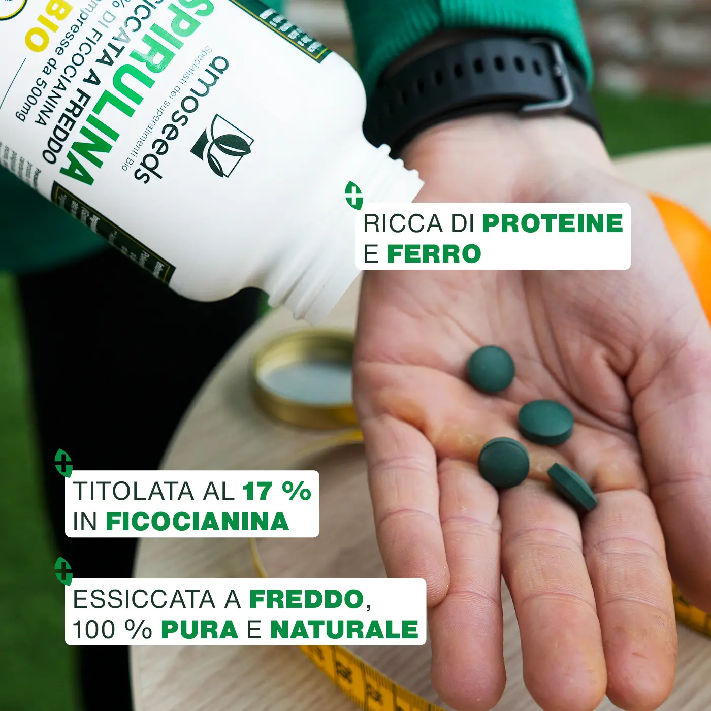 NUTRIZIONE: questo superalimento Bio ha proprietà nutrizionali uniche che gli permettono di rivitalizzare l'organismo in profondità. La Spirulina Bio è molto ricca di proteine vegetali di alta qualità (61% del peso totale), che aiutano a mantenere e sviluppare la massa muscolare, e di ficocianina (17%). Quest’alga è anche un'ottima fonte di ferro (52mg per 100g), che aiuta a ridurre la stanchezza, garantisce la normale attività del sistema immunitario e il normale trasporto dell'ossigeno, necessario al corretto funzionamento dell'organismo. Un consumo quotidiano delle nostre compresse di Spirulina Bio garantisce una copertura ottimale del 18,5% del fabbisogno giornaliero di ferro, consentendo di mantenere quotidianamente un alto livello di vitalità.