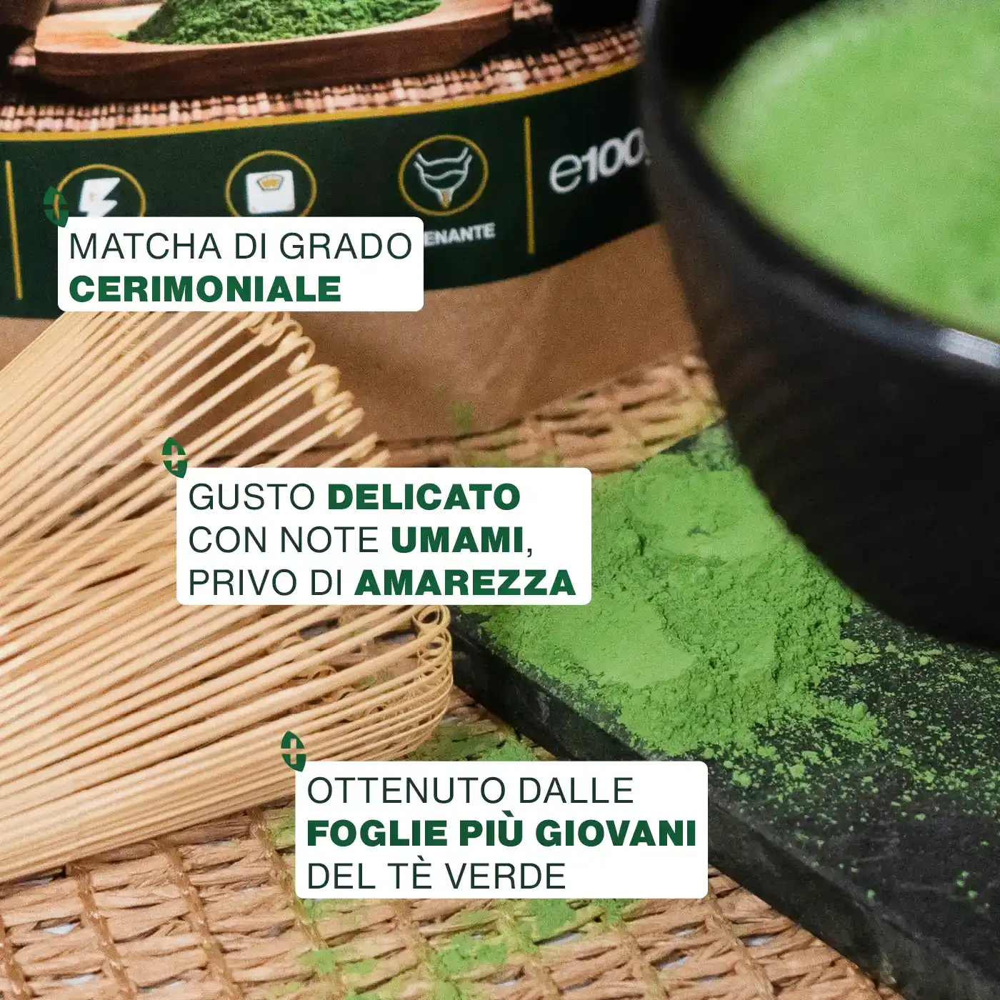 ENERGIA, VITALITÀ: il Tè Matcha, utilizzato da molti anni come tonico naturale, è un superalimento ideale per chiunque voglia sentirsi più energico. Se consumato regolarmente, aiuterà a combattere la stanchezza, sia fisica che mentale, e a rafforzare il corpo in profondità. Questo tè è un vero e proprio stimolante, ed è consigliato a chi vuole mantenere un benessere generale durante tutto l'anno e migliorare la propria produttività quotidiana.