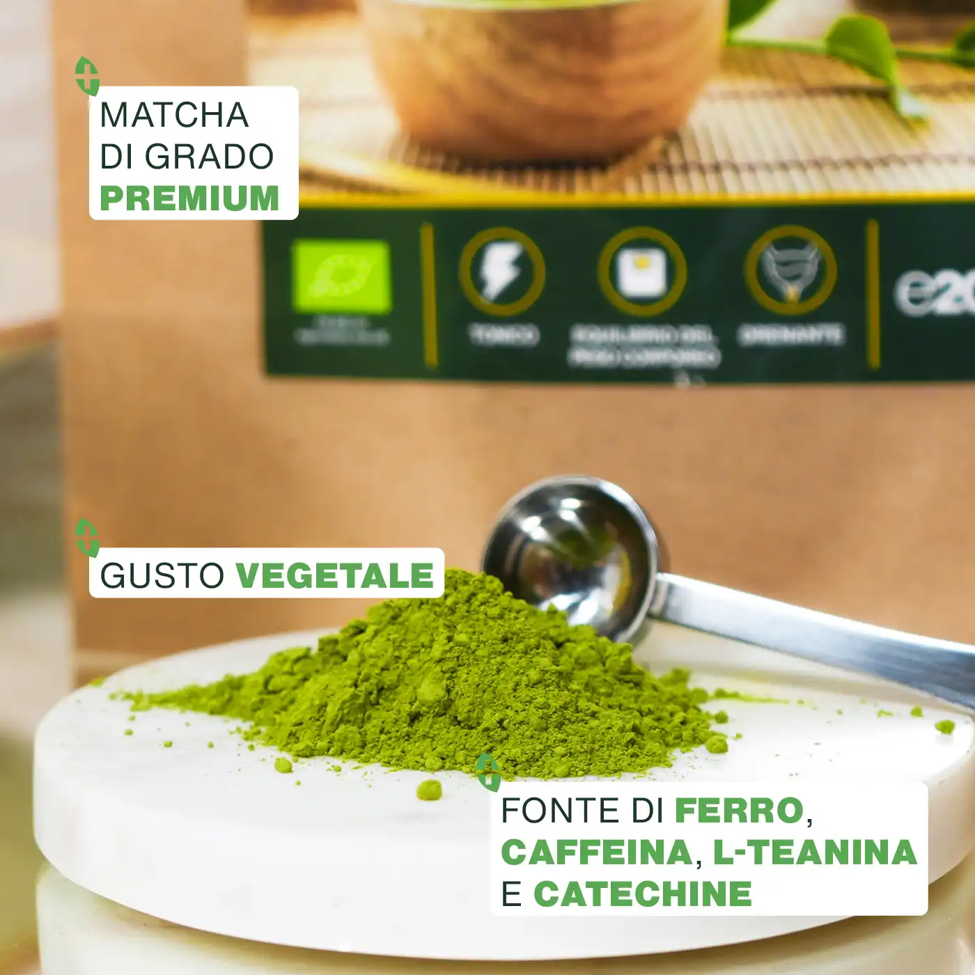 - CERTIFICAZIONE BIOLOGICA: bustina Kraft richiudibile e riciclabile di 200g di polvere di foglie di Tè Matcha Premium giapponese biologico di qualità superiore. Prodotto 100% naturale, puro, vegano, senza additivi, senza conservanti, senza OGM, senza pesticidi, senza coloranti artificiali, senza lattosio, senza soia e senza glutine. Ogni lotto è testato da terzi per garantirne qualità e purezza.
